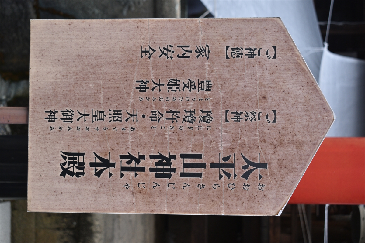 太平山神社には天照皇大御神の孫である瓊瓊杵命(ににぎのみこと)天照皇大御神 伊勢神宮の外宮に祀られる、衣食住の守護神豊受姫大神(とようけひめのおおかみ) をはじめ多数の神様を祭られているという事で大変後利益がありそうです。