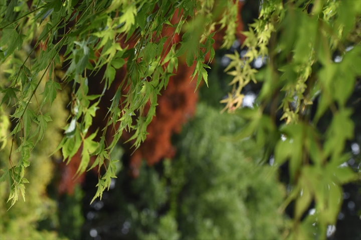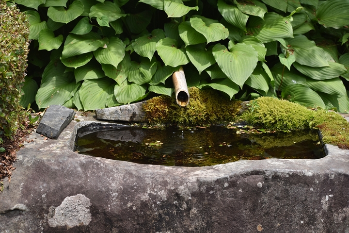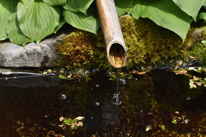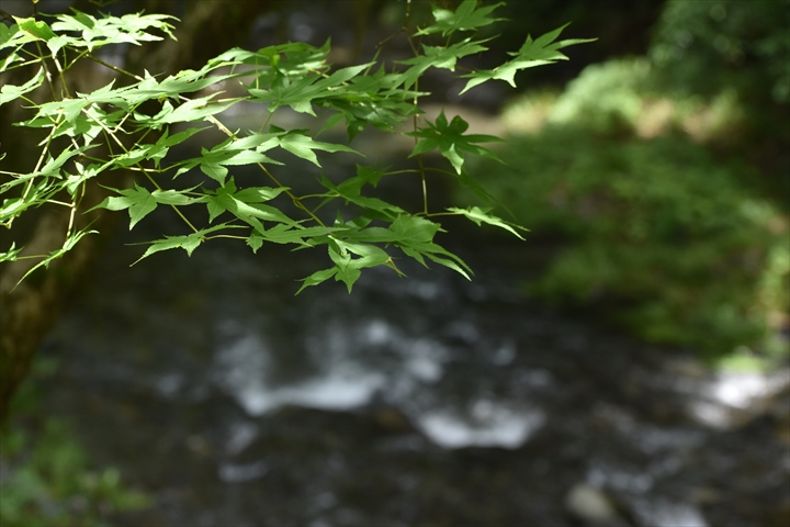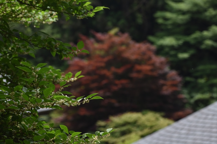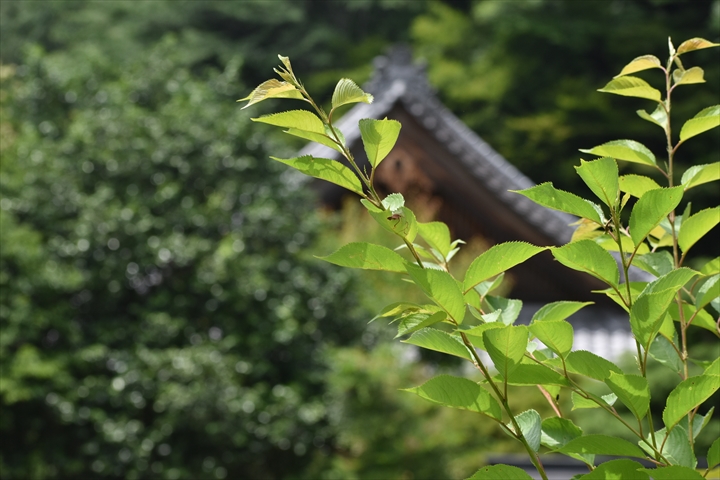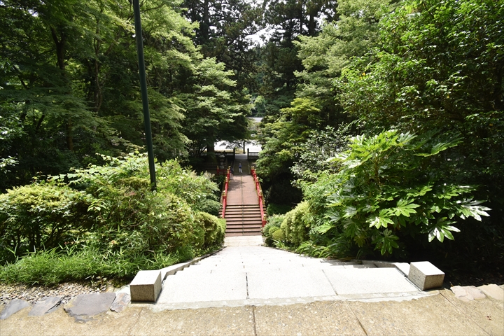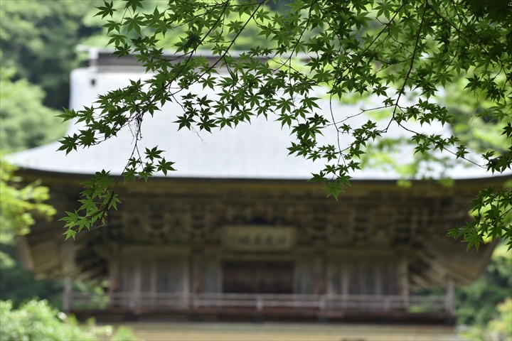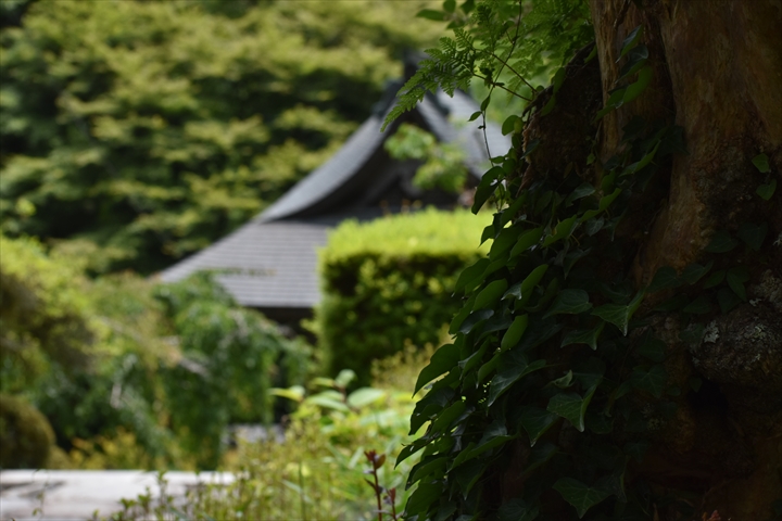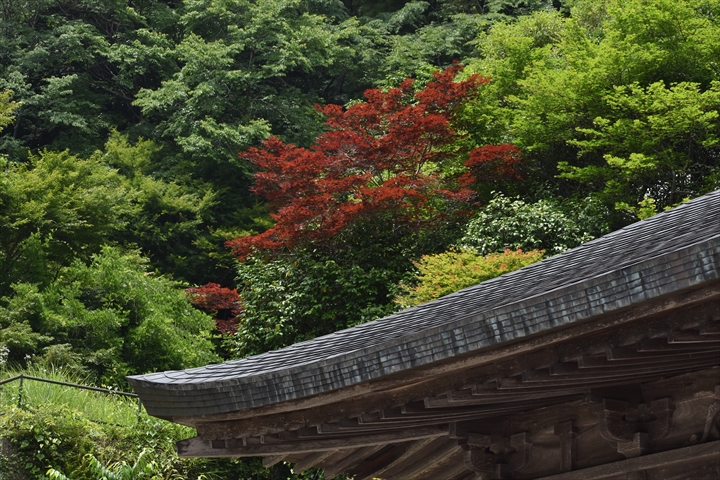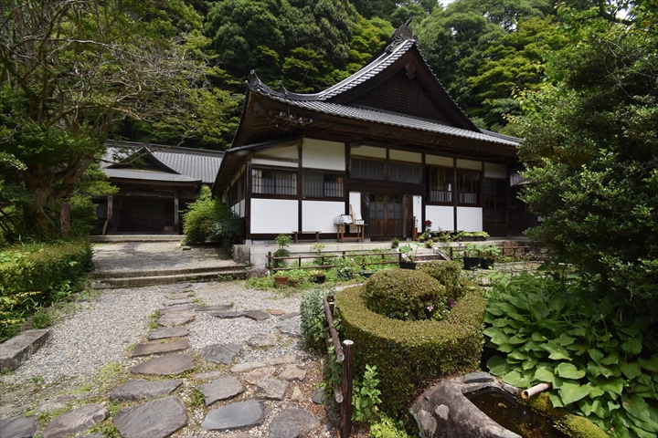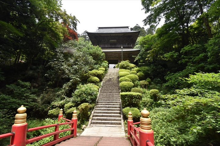 本堂は入り口の横に流れている川を渡り階段を登った高いところにあり、緑豊かな山木に包まれた中に建立されています。